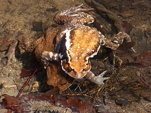 「カエル合戦」とは、時は啓蟄(けいちつ)の頃、ヒキガエルの雄がメスをめぐって壮絶な戦い(カエル合戦)を繰り広げます。今日、富村で観察することができました。昼間でも頑張っていました。