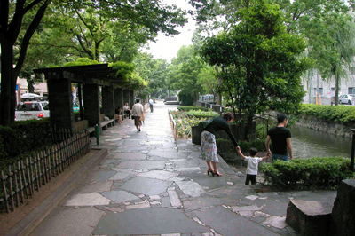 | 岡山駅から歩いて5分程度。西川緑道公園は、自動車が頻繁に行き来する道路と「西川」という川幅の狭い河川に挟まれた細長い空間を利用して設置されている。撮影当日は、学校での模擬試験(6月7日)が終わって後で、午後4時頃であった。人通りはかなり頻繁で、老人や子どもたちの占める割合がたかいような気がする。設置された彫刻に眼をとめているような人はいない。なにげなく通り過ぎているような感じで、彫刻も日常の風景の一部になってしまっているのだろうか。 |