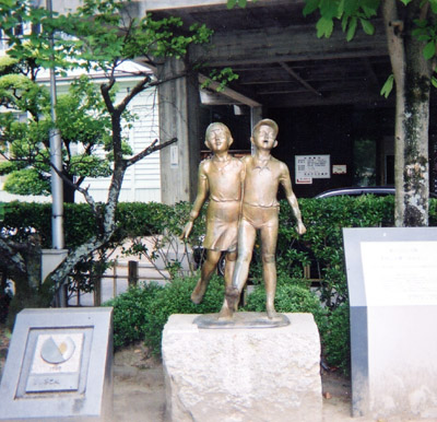 | この彫刻は「歌うブロンズ像」(像の前にセンサーがついていて童謡が鳴る)の一連の作品で、これらがつくられるようになったいきさつは、次のようなことからです。昭和60年に、日本童謡協会会長中田喜直氏が高梁市に来られ、「美しい山と川、谷川のせせらぎ、・・・。高梁には故郷に帰ってきたようなやすらぎを感じる。耳を澄ますと子どもたちの童謡が聞こえてくるようだ。童謡の似合う街である。」と話されたことがきっかけになって、昭和61年から「心豊かな人づくり、街づくり」を目指して、「童謡の街づくり」が始まった。男の子と女の子が共に笑顔を浮かべて、仲良く歩いている雰囲気が伝わってくるようだ。 |