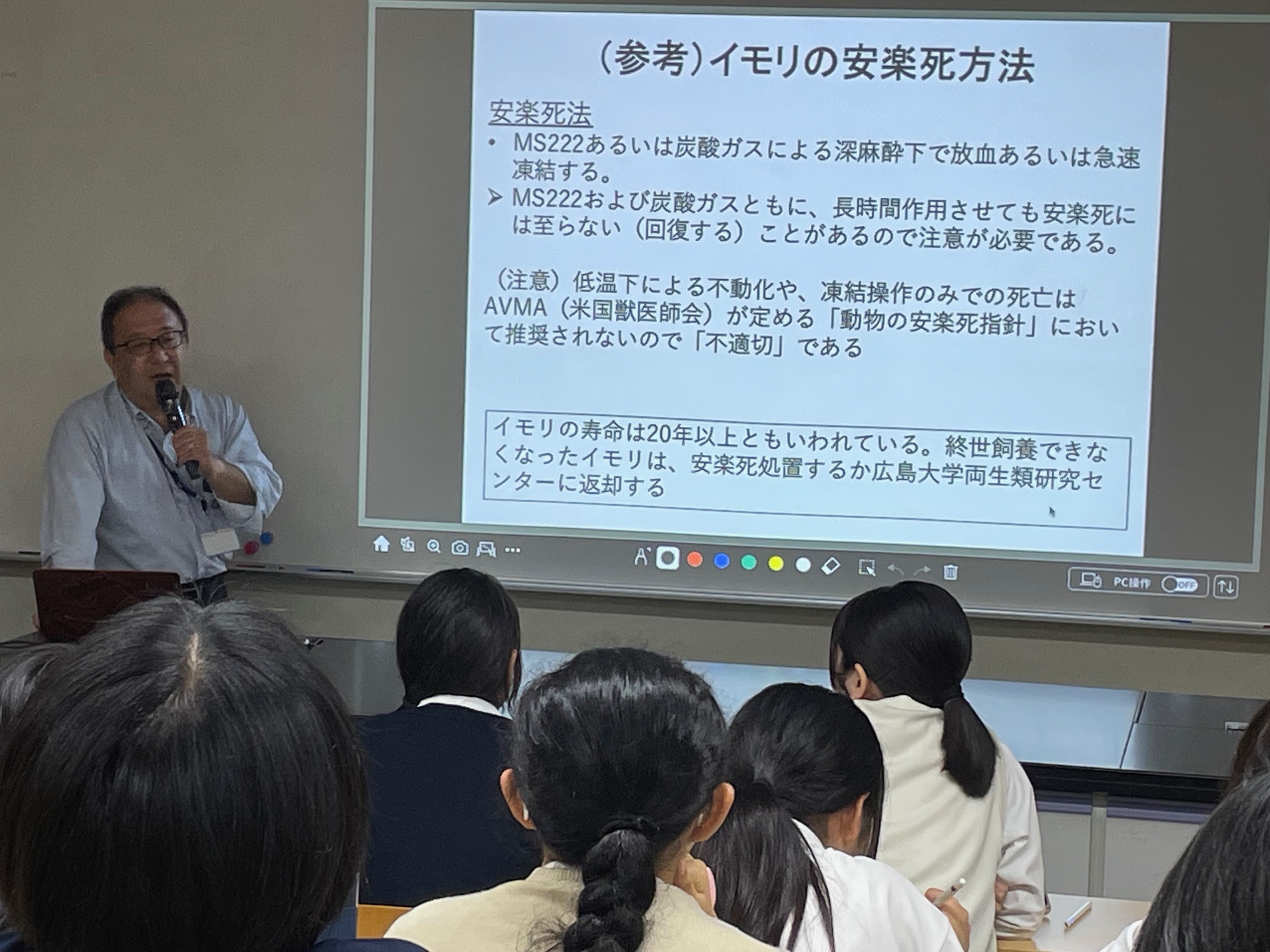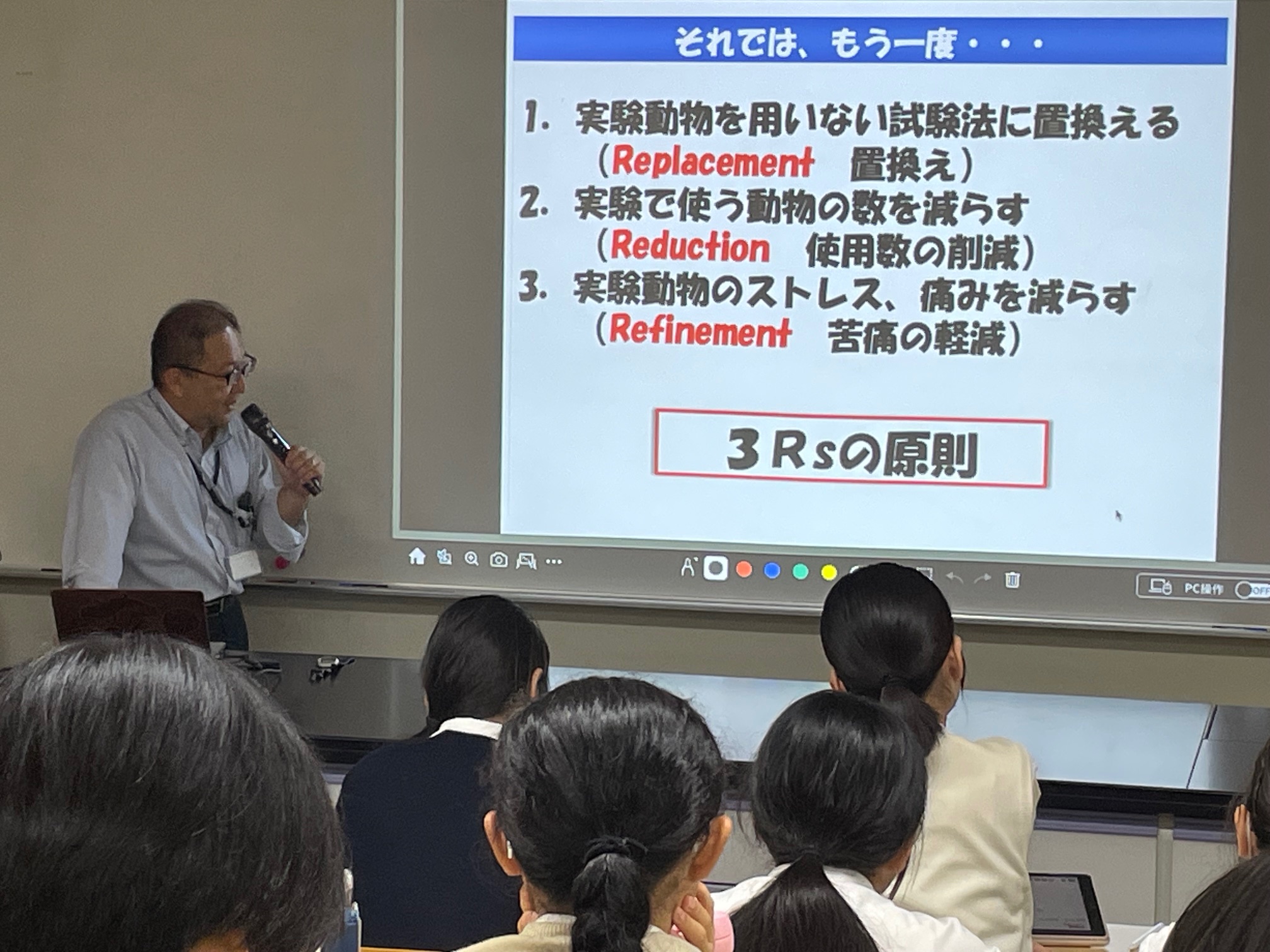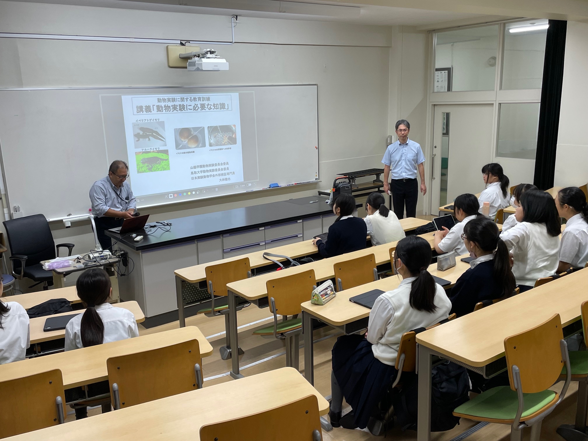 本校動物実験委員会の委員である鳥取大学の大林徹也先生を講師にお迎えし、動物実験の研修会を実施しました。本校の生命科学分野の研究では生命倫理を重視しており、動物実験は研究計画段階で申請し、委員会の承認を得なければ実施できない仕組みになっています。委員会では、法令や各種指針に基づいて実験計画の審査や教育訓練を行い、適正な研究活動の推進に努めています。今回の講習会には、動物実験を計画している生徒30名が参加し、実験動物の定義や計画書作成の留意点、研究倫理・生命倫理の基本理念などについて学びました。生徒たちは「生物を単なる材料として扱わない」という姿勢を改めて心に刻みました。