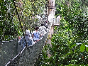 ポリン温泉は、キャノピーウォークで、森林を高い位置から観察できる。生徒は、高いところで樹間を渡るということでハラハラし、ドキドキした気持ちしか感じていないかもしれないが、理科を教える立場では、1学期に学習した熱帯樹林の話を思い出してほしかった。