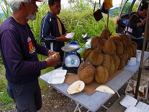噂のドリアンを購入して、生徒と試食した。ドリアンの東南アジアのマレー半島。 果実は強い甘味を持ち、ビタミンB1が多く栄養豊富なため、国王が精力増強に食していた。今日では「果物の王様」と呼ばれている。食べる部分は甘い香りがあるが、それ以上に、玉ねぎの腐敗臭のような強烈な匂いがある。噂には聞いていたが、臭いで気分が悪くなった生徒もいたので、苦手な人は大変だと再認識した。食べるられるのは、種子の周りのクリーム状の部分だけで、果実全体に占める可食部分の割合は少ない。