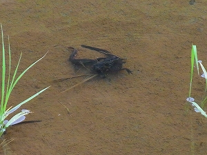 日田市の山間部でアカハライモリの生息状況を調べた。休耕になっている水田もあったが、昔ながらの水田も見ることができ、2カ所でアカハライモリを確認できた。水田に水をはられてから間もない状況であったが、イモリの産卵行動(写真は雌雄の配偶行動)を観察することができた。赤い腹を上に向けているので死んでいるのかと思ったら産卵中だった。カメラを近づけると急いで逃げて行ってしまった。その近くの雑草を拾い上げてみると産み付けられた卵を見つけることができた。