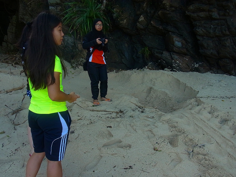 座間味島阿佐地区の宿泊しているホテルから歩いていける砂浜を散策していたら、砂浜にカメの歩いた痕跡を見つけた。産卵期は4月から6月であることを考えると、産卵しにきたとは考えにくいが、産卵行動の痕跡のように思えた。