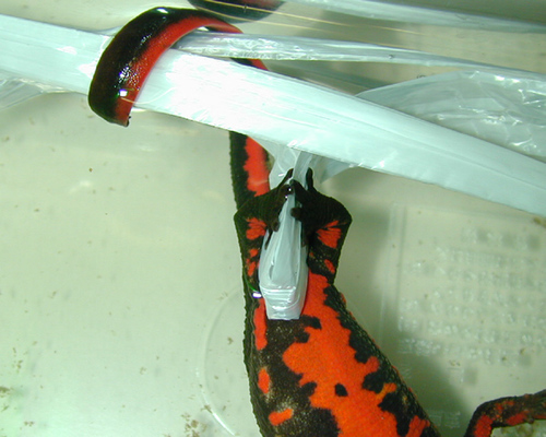注射したイモリを入れた水槽に細いビニール紐を入れておけば、その紐に卵を包む形で一つずつ産み付けるので、ピンセットでゼリーをしごくようにして、採取すれば卵を痛めることはない。また、卵を一個ずつ産むので、一匹の雌が産む卵であっても、発生開始に時間的なずれが生じるので、発生的に異なった段階の胚を観察することができる。孵化までに要する日数は、飼育水温が上がるにつれて短くなる。15℃で約35日、20℃で約20日である。