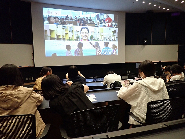 清心女子高等学校生命科学コースの沖縄環境学習1日目は、森林実習に琉球大学与那演習審に向かうのだが、その前に途中でOIST(沖縄科学技術大学院大学)で女性研究者の講演を聞かせていただいた。