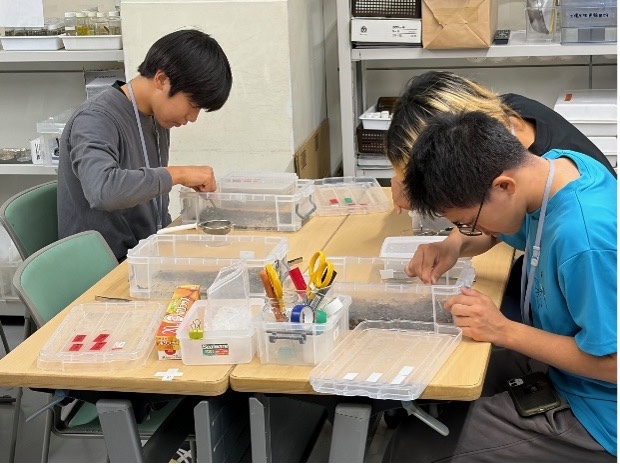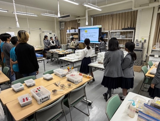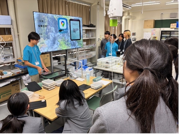 11月1日、山脇学園では、学内に生徒が両生類を対象とした研究に取り組むための施設「山脇有尾類研究所」を開設しています。この日は、同じ港区内にある麻布中学・高等学校から、生徒5名と引率の教員2名が訪問されました。所長が研究所の概要を説明した後、動物飼育室での見学や、イモリやサンショウウオへの給餌体験を行いました。その後、お互いの学校の研究の取り組みについて発表し、活発な情報交換を行いました。本校の生徒は、オオイタサンショウウオのビオトープ造成に挑戦しており、放流前の幼生飼育実験の成果を発表しました。