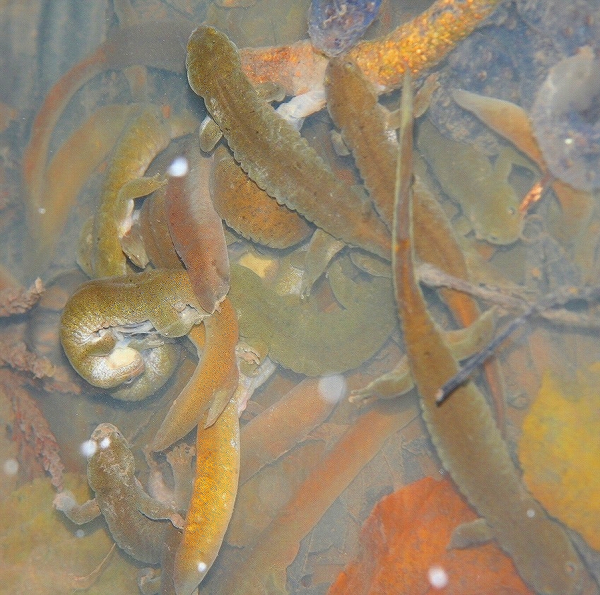 2009年1月24日、九州はこの年一番の寒波に見舞われていた。大分県国東市での野外調査である。午前10時、山際を散策していると、林の中に水田跡の湿地があった。残雪が残る静かな林の中で、溜まりの水面がわずかに波打っているのが見えた。近寄ってみると、オオイタサンショウウオが群がり、まさに産卵の最中であった(写真)。