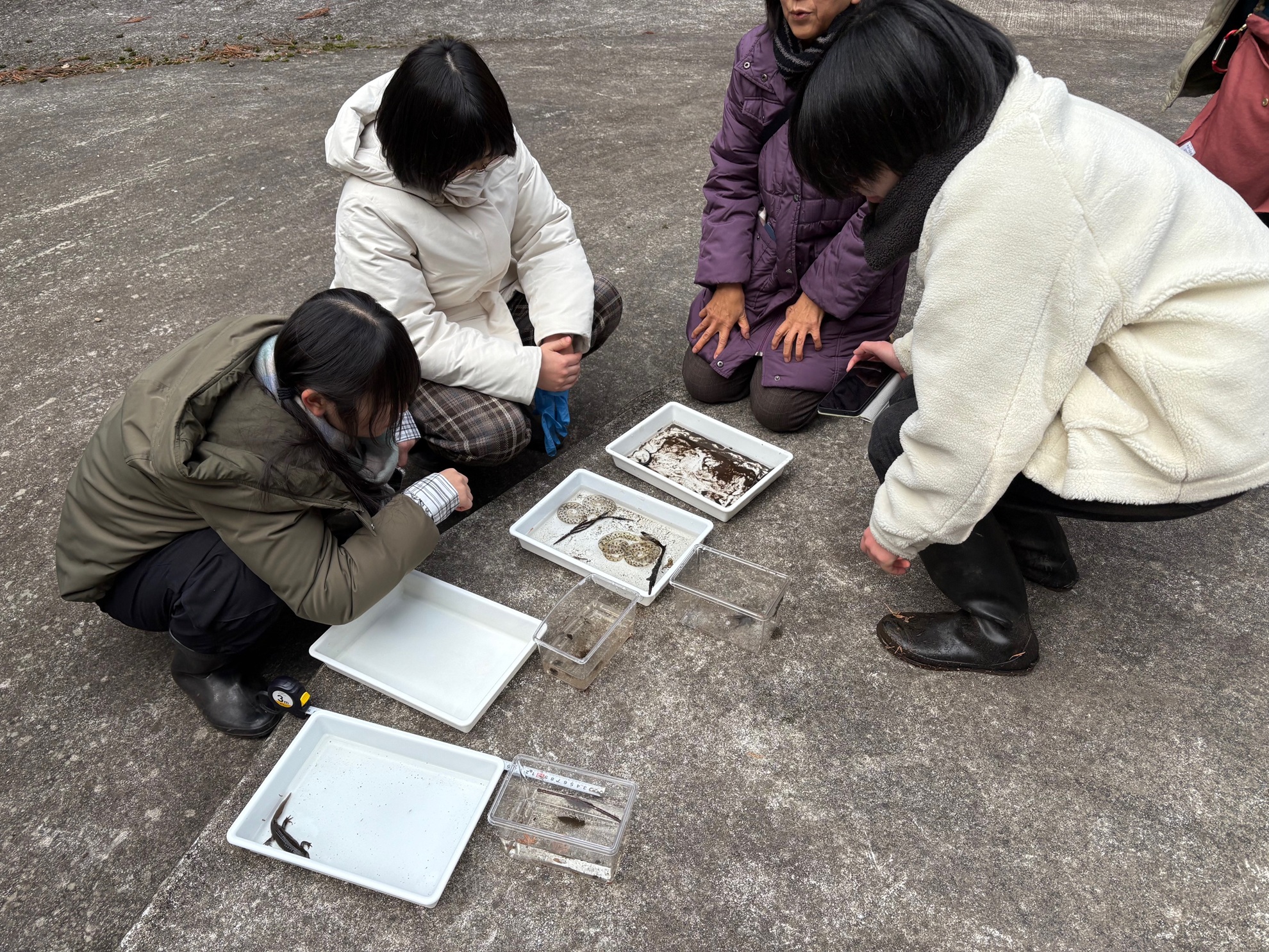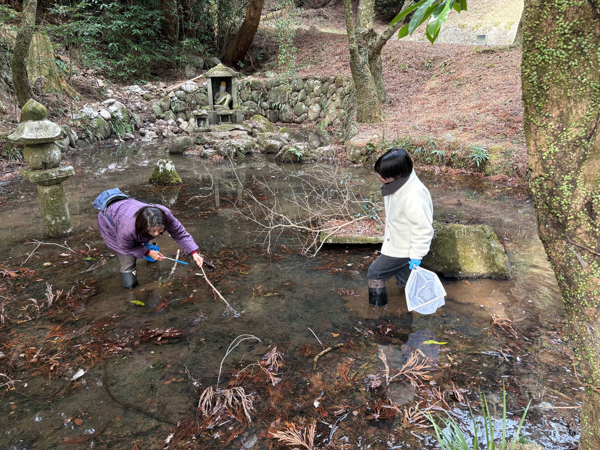 1月31日、学校内にオオイタサンショウウオが生息・繁殖できるビオトープの造成に着手していますが、その生態を理解するため、繁殖期に大分県立大分上野丘高等学校の生徒と合同で野外調査を実施しました。