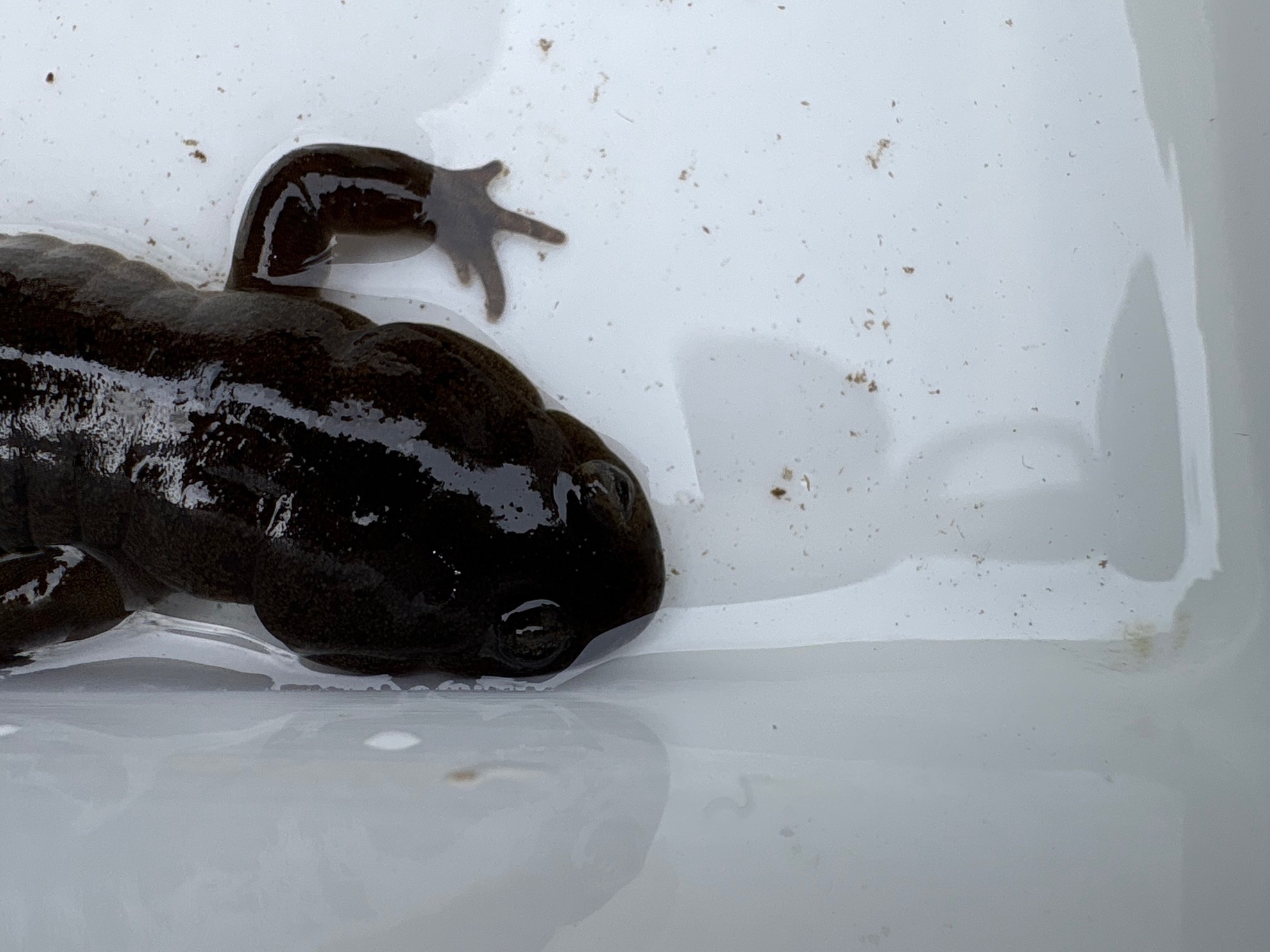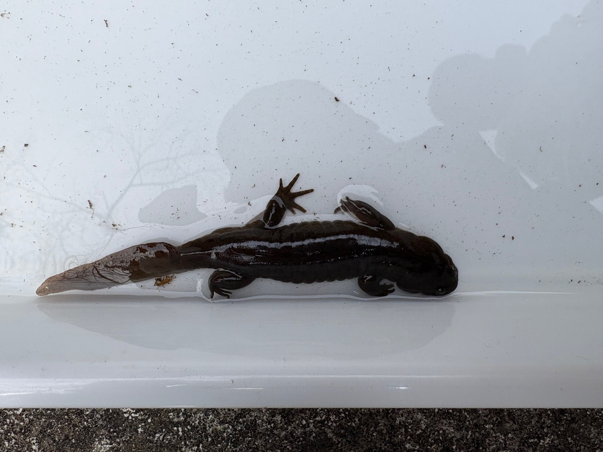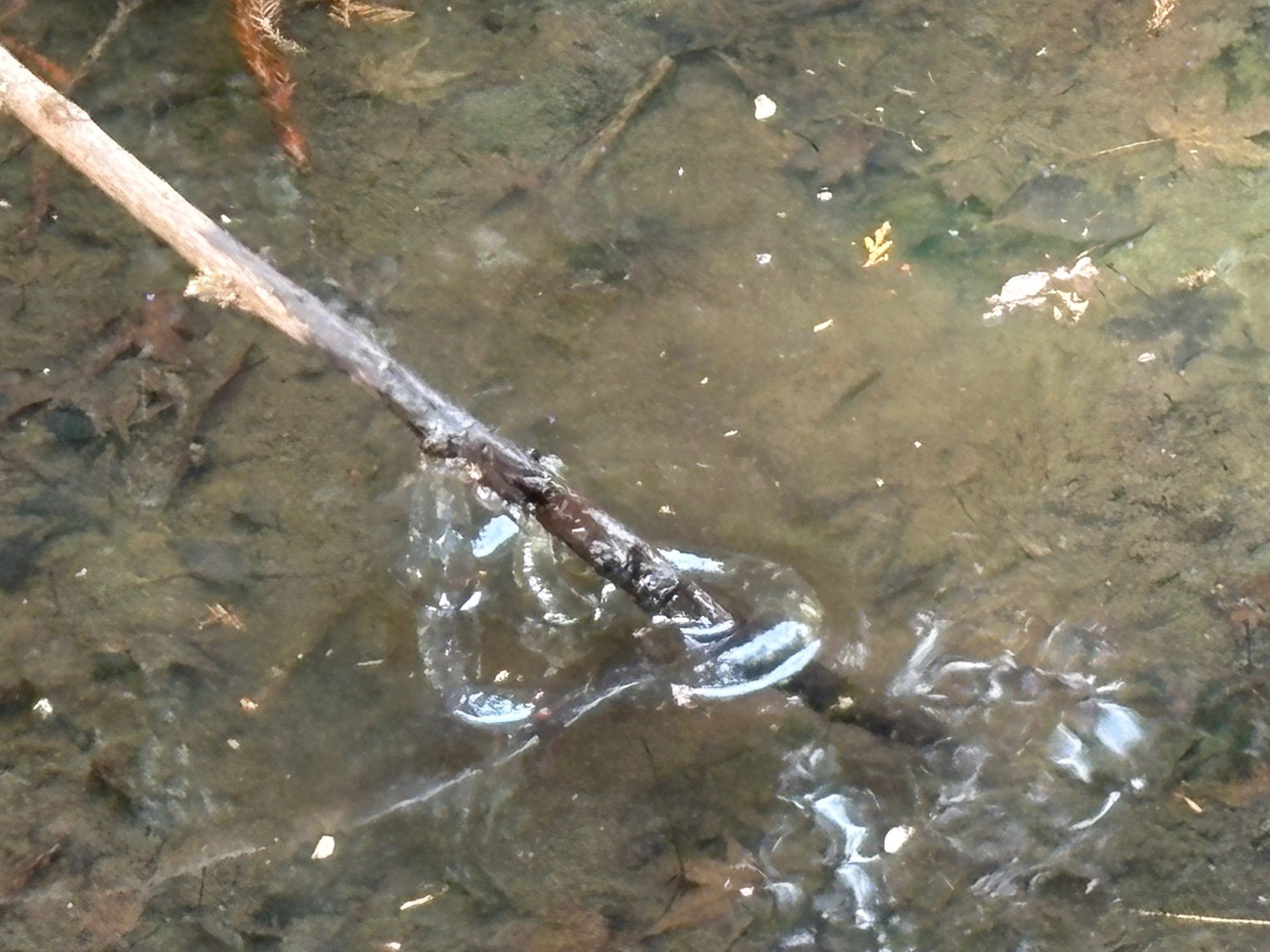 卵嚢は6対確認され、池の浅い部分の枝に産み付けられていました。その産着状況や位置についても記録しました。また、オオイタサンショウウオ雄成体を1個体、アカハライモリ成体を4個体、さらにヤゴやヨコエビなどの水生昆虫も確認することができました。
