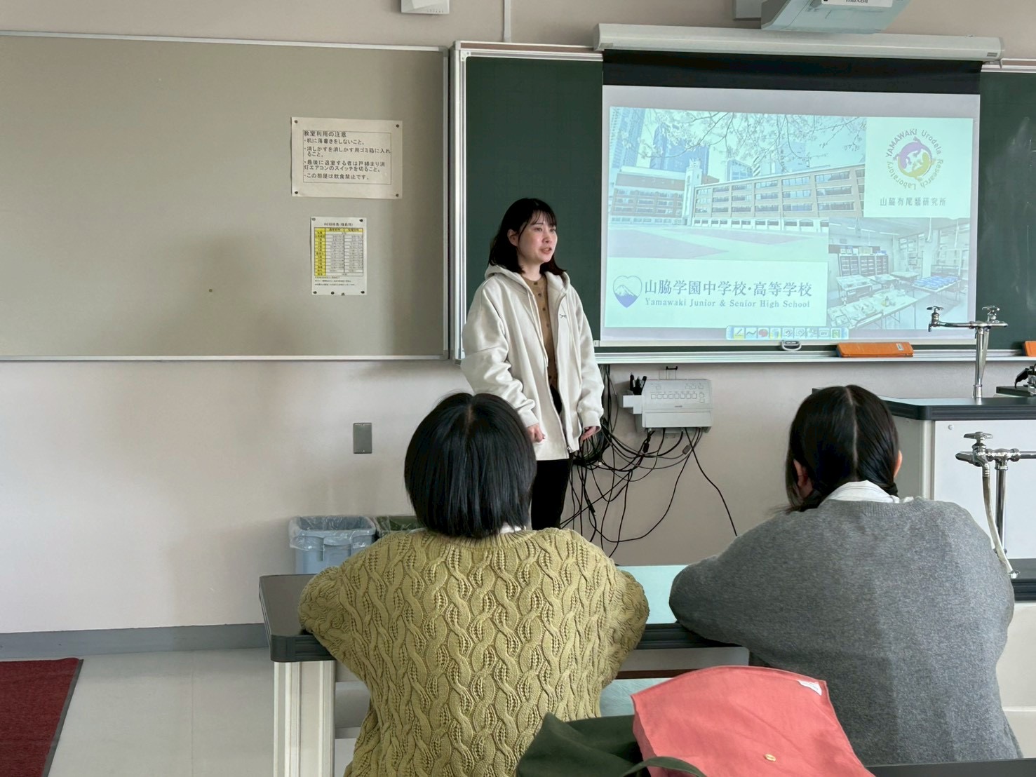 大分上野丘高等学校に移動して、生徒の研究交流会を実施しました。発表は「山脇学園の紹介(水津)」5分、「飼育下におけるオオイタサンショウウオの成長特性に関する研究(山脇学園高等学校)」15分、「キンギョの認識について(大分上野丘高等学校)」15分で行われました。今回の合同調査、研究発表、実験室見学を通して、高校生同士の活発な交流が見られました。