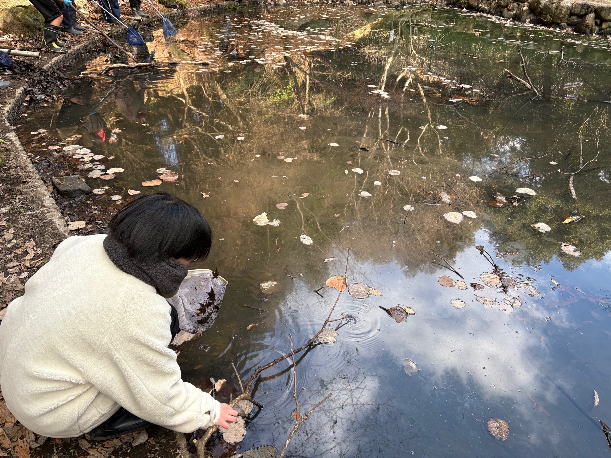 2月1日、昨日に続き、県立大分上野丘高等学校生物部の生徒と合同で、オオイタサンショウウオが繁殖する池で、産卵場所と各場所での卵嚢数を記録しました。合計で確認した卵嚢は17対で、成熟雄がオオイタサンショウウオが2個体、他にヤゴやミズカマキリなどの水生昆虫も確認できました。