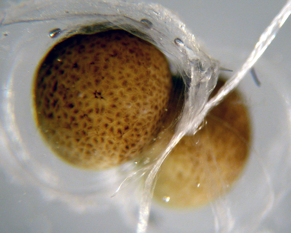 イモリはゴナトロピン(絨毛性ゴナトロピン)を注射することで産卵を誘発できます。1匹から多いときには50個以上の受精卵を採取することが可能です。繁殖期の雌は貯精嚢に精子を保持しているため、産卵時を発生の開始時刻として観察できます。