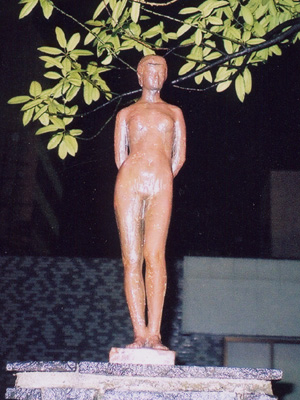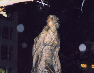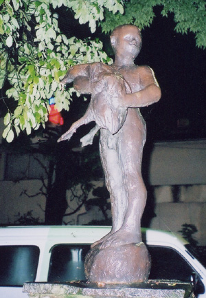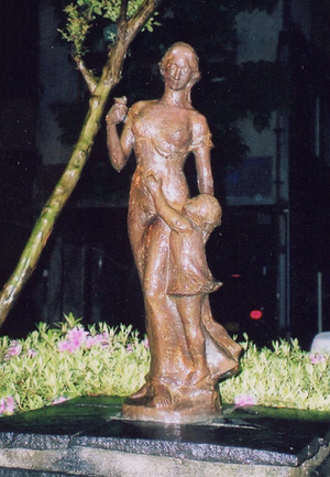| 作者は上の写真の人と同じなんですが、こっちの像のほうが完成度の高い作品になっていますが、片方だけ胸がはだけています。何故胸をはだけさせる理由があるのだろうかと思いました、これで服を着ていても少女と母親が小鳥と戯れている姿が浮かびます、母の手に乗った小鳥を見たい、そして私も小鳥を手に乗せたいと服をひっぱる少女に目を落としほほえんでいる母、温かい雰囲気のする像になっているのに・・・。 |