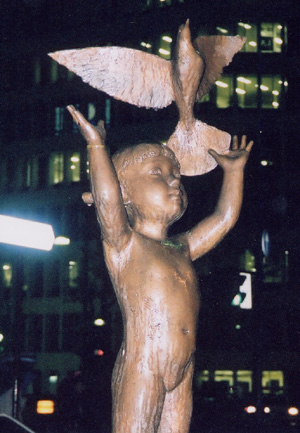| 少女と鳩です。像には鳥が人物と共に造られることが多いですね。平和の象徴の鳩が少女の高く掲げられた手から飛び立とうとした瞬間の像です。きっと少し前まで少女の腕の中でしっかりと優しく抱きしめられていたんでしょう。 |