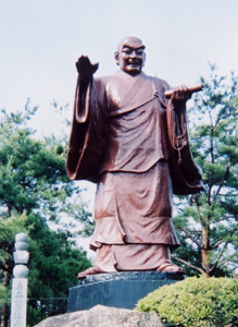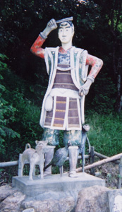 | 神社の駐車場の端に建ててある。この神社では、弓道の大会などがよく行われ、牡丹の花などが咲き出すとたくさんの人で賑わう。像が建ててある駐車場はたくさんの車や観光バスが停めれるように広く作ってある。 |