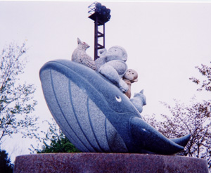 この高速道路をまっすぐ行くと、海につながっているらしく、その海(日本海)では、たくさんの鯨が見られることから、この像も、桃太郎が鯨に乗ってるんだそうです。全体的に丸みを帯びているような感じで、何だかかわいく見えます。大人も、子供も見るものだから、かわいくしているのかな?岡山は、やっぱり”桃太郎”の話が残っているように彫刻もたくさんあるんだな、と思いました。 |