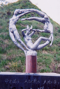 | 旅行に行った時、たまたま道路沿いで見つけたこの像は、何か不思議なものを感じました。3人の女の人が、輪のように繋がり合っていて,まるで遊んでいるかのように見えました。題”命を洗う・天恵に祈る・天地に舞う・大山を讃える”ということから考えた事は、この3人は、作者の人から見たら、神様か天使のようなものを想像して造ったんじゃないかな?と思える事でした。この像に関しては、着衣より裸のほうが良いように思いました。残念なのは、像の置いてある場所があまり人には見られないところだということです・・・。 |