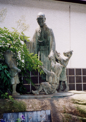 | 良寛は越後に生まれ22歳の時円通寺十世人忍田仙和尚の徳を慕って妬く20年間禅の修業を重ねた。毬を持った良寛と、その手を引っぱり今にも「遊ぼう」と言い出しそうな三人の子供たち。良寛は子供に好かれるような楽しい性格の持ち主だったのだろうか。 |