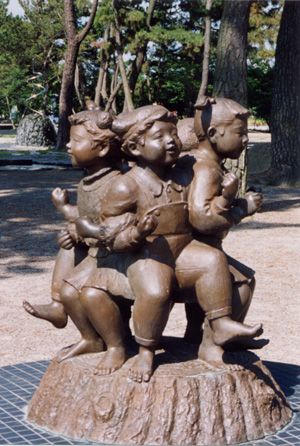 | いつも人がたくさん集まる酒津公園。特に土日、祝日は多くの家族連れや子供たちが遊びにやってきます。そんな公園にぴったりのこの銅像。五人の子供たちが、仲良く手を組んで楽しそうにおしくらまんじゅうをしています。裸像が多い中、心温まる作品だと思う。 |