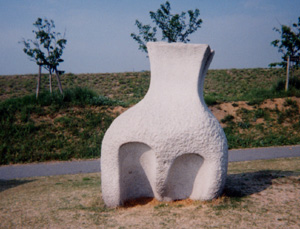 | 抽象的な作品ですが、と言っていいのかどうか、裏にまわって見るとおしりのような、前を見ると鼻の穴のようにも見えるし、フォークなのか、シャベルのつもりなのか、いろいろ考えられる。タイトルを見ても「土のにおい」人は子供の頃土いじりをして、また、年老いて、土いじりをしたくなるように、土いじりは安らぎを与えるのかな?昔から人は死んで土にかえるといいます。「土のにおい」どろまみれということなのか、自然、やさしさ、めぐみ、ふれあい、それとも何だろう。アスファルトに囲まれたこの世の中で「土のにおい」私にはむずかしいけど、なんだか忘れていたような気がして大事にしないといけないことに思えた。 |