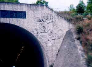 | 車で旅に出て景色を見る所もなくただただ走っているというのはつまらないものです。そんな時トンネルがあったりすると、このトンネルは何メートルあるのか?とか、トンネルを抜けるまで息が止めれるか?とか目的地に着くまでにトンネルは何本あるでしょう?などつまらないゲームをしたりします。いつもは気にもしていないトンネルなのに、この時ばかりはトンネルが主役です。アッ、何メートルと書いてあるなど言ってキャーキャーワ−ワーと入口が近づくたびに車の中でもりあがっています。そんな時目に留るのが外壁の彫刻です。一瞬、心がさわやかになったような気になって、トンネルを作った方々の思いを感じます。時々このようなトンネルに会います。もっと沢山あれば旅も違った意味で楽しくなると思いました。 |