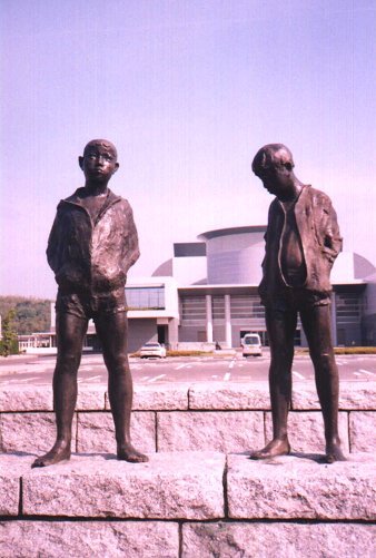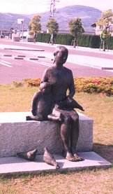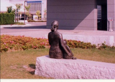 小さな子供を横に、すっとした姿勢で遠くを眺める母親。足元や膝の上には鳩らしき鳥も止まっている。母親とはいっても、何だかまだ随分と若く見える。子供が横にいなかったら普通の少女に見えていたかもしれない。しかし右手でそっと子供を抱き寄せているその仕草はやはり母親のそれであるように思う。口を閉じ、やや硬い表情で子供と共に前を見つめる母親。「遠望する母と子」という題だが、何を見つめているのだろう。確かなものより、不確かなものを見ている気がする。この姿はどこか「昔なつかし」さ的なものを感じさせる。この像には夕日と赤とんぼが一番よく似合うような気がした。 私はこの像から、未来への遠望より過去への遠望を見た気がした。 |