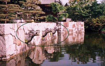 この公園は昔、遣唐使として古代の中国に派遣されたとある人物(吉備真備公)にちなんで作られた公園であるため、内部にあるものはどことなく中国を思い浮かべるものが多い。この龍(だろうか?)からもそのようなものが連想させられる。これ以上近付けなかったので見にくいが、これは三頭仲良く頭を並べている。この日は生憎だったが、しばしばこの像は口から水を出し、公園の美しい景観の一部分になっている。 |