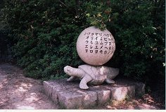 | 歴史的片仮名使い的な五十音字が記された球を甲羅に乗せている亀である。納得いきそうでいかない組み合わせ。この地域にあるのは桃太郎伝説だが、これはまるで浦島伝説に出てくる亀のような感じだ。この文字と亀もかの遣唐使吉備真備公と何か関連があるのだろうか・・・? |