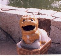 | 彫刻とはかけ離れているように思うが。というより焼き物(七宝焼きの類)のような気もするが。まともな彫刻らしいものを他にもう探し当てる事ができなかった。が、しかし。この置物のぼけっとした愛嬌はどうだろう。実に好ましい。実に微笑ましい。個人の趣味に走ってしまって申し訳ないが可愛いことこの上ない。思わずシャッターを切ってしまった。このぱか、と無防備に開けられた口はどうだろう。あのつぶらなぬばたまの瞳はどうだろう。そしてこちらを見上げるようなこの姿勢。なんとも無邪気な感じだ。見ようによれば頭から喰われそうな感もあるが、ここは素直にこの像を見よう。 |