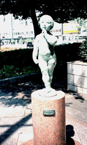 | 桃太郎は、岡山のシンボルだから一番人通りの多い所である岡山駅前にせっちされているのだと思われる。多くの観光客が目にしていると思われる。でも、私自身のイメージでは、桃太郎は、着物をきている姿が連想さてしまうが、設置されている彫刻の桃太郎は何故か、「裸」であった。写真をみるとしぐさも女性的な雰囲気がするので、私のもっている桃太郎のイメージとはかけ離れたもので違和感があった。服を着た、男性的な「桃太郎」をつくって欲しかったと思う。 |
