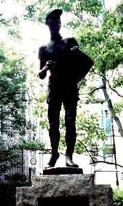 | この像の、下には説明や詩のような言葉がたくさん書かれてあった。これは、新聞を配る少年の大変さが伝わるように、作られたのかと思う。私は、なぜこの作品が目立たない、木に覆われた川沿いという場所に作られたのか?と不思議に思う。新聞を配る人の大変さを分かって欲しいなら、もっと目立つ場所や市役所に建てるべきだと思う。 |