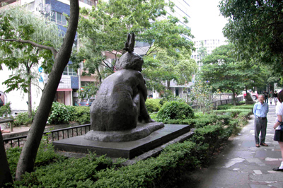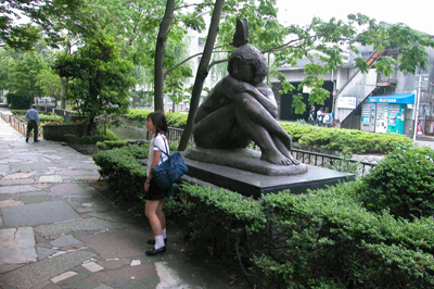 | 岡山駅から歩いて5分程度。西川緑道公園は、自動車が頻繁に行き来する道路と「西川」という川幅の狭い河川に挟まれた細長い空間を利用して設置されている。撮影当日は、学校での模擬試験(6月7日)が終わって後で、午後4時頃であった。人通りはかなり頻繁で、老人や子どもたちの占める割合がたかいような気がする。設置された彫刻に眼をとめているような人はいない。なにげなく通り過ぎているような感じで、彫刻も日常の風景の一部になってしまっているのだろうか。 |