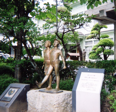 | この彫刻は「歌うブロンズ像」(像の前にセンサーがついていて童謡が鳴る)の一連の作品で、これらがつくられるようになったいきさつは、次のようなことからです。昭和60年に、日本童謡協会会長中田喜直氏が高梁市に来られ、「美しい山と川、谷川のせせらぎ、・・・。高梁には故郷に帰ってきたようなやすらぎを感じる。耳を澄ますと子どもたちの童謡が聞こえてくるようだ。童謡の似合う街である。」と話されたことがきっかけになって、昭和61年から「心豊かな人づくり、街づくり」を目指して、「童謡の街づくり」が始まった。男の子と女の子が共に笑顔を浮かべて、仲良く歩いている雰囲気が伝わってくるようだ。 |