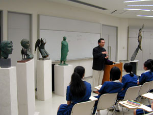 | 実際の作品を教室に持ち込んでの、出張美術館という感じで、本格的な作品をじっくり見る貴重な体験ができた。また、作家の側がどんな視点でつくっているかも話していただき、講演後も興味を持った生徒がいろいろな質問を投げかけた。丁寧にわかりやすく教えていただいた。 |