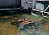 飼育小屋のそばには、小さな池があり、コイが泳いでいました。そこには、大・小さまざまなコイがいました。正確な数はわかりませんでしたが、たぶん13匹ぐらいいると思います。池は、小学校の裏を通る自転車道路沿いなので、ゴミを投げ入れられないように、網がかけられています。