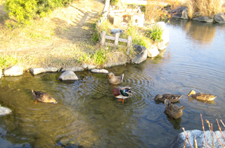 カモ 鳥類 6羽 広い池で飼育されていた。池の中の藻を食べていた。