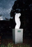 題:「バスケットボール」 場所:NKK体育館前庭 1987年に制作されたもので、作者はニューヨークで石の直彫りを学んだ。現在ニューヨークで活躍中。アジア大会にちなんだ作品としても味わいがあるし、ちょうど市立体育館の前に設置してあるので、動きのある作品はこの場にふさわしいと思う。 |